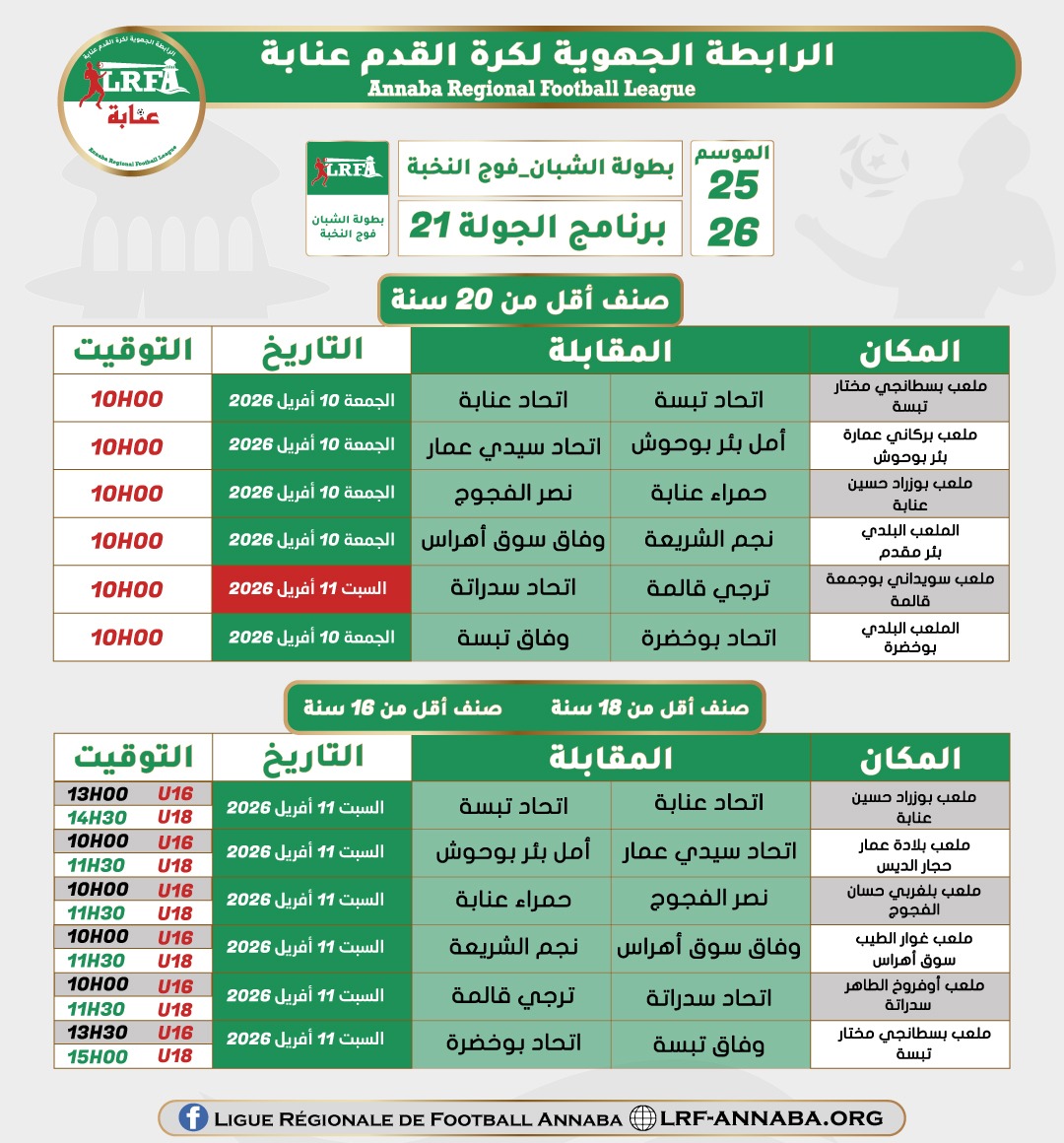 برمجة مباريات الجولة 21 لبطولة الأصناف الشبانية في فوج النخبة ليومي الجمعة 10 و السبت 11 أفريل 2026