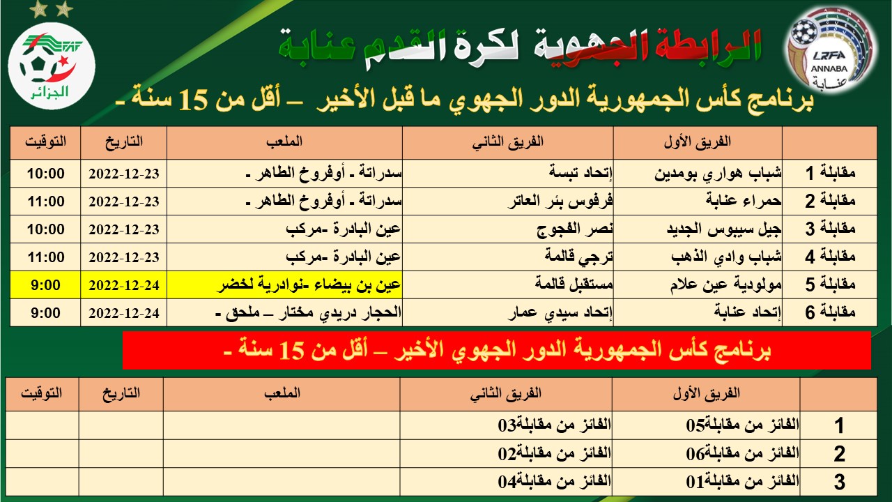 Image تغيير تاريخ مباراة اتحاد عين بن بيضاء اولمبي الونزة اقل من 19 سنة #