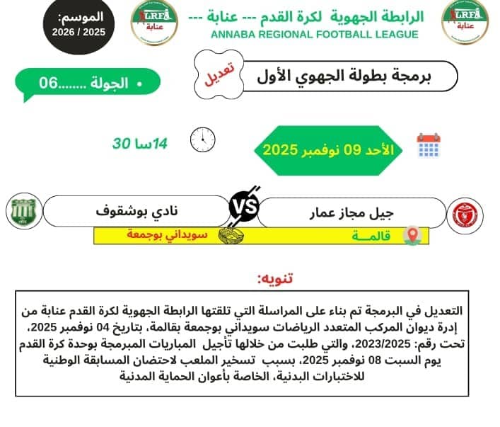 برمجة مباريات الجولة 06 لبطولة الاصناف الشبانية في فوج النخبة ليومي الجمعة 07 والسبت 08 نوفمبر 2025تعديل