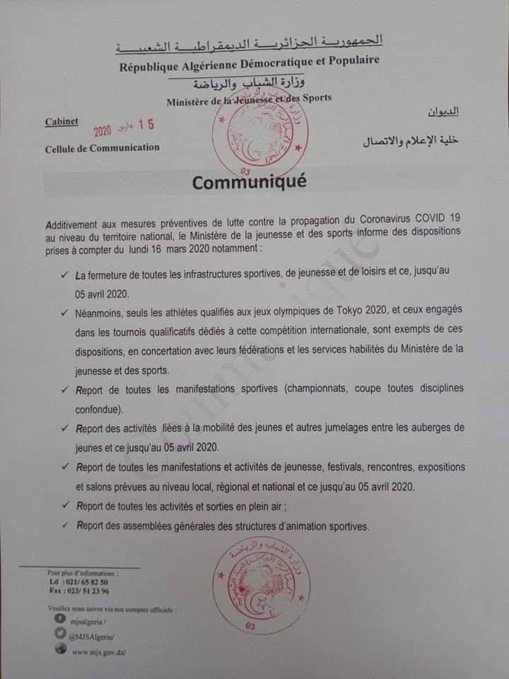 Prévention du coronavirus COVID 19Prolongation du report de toutes les activités et compétitions sportives jusqu'au 19 AVRIL 2020 ... (Communiqué MJS)
