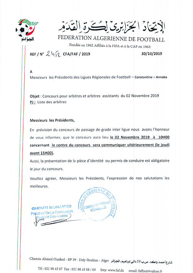 بناء على مراسلة اللجنة الفيدرالية للتحكيم تنهي الرابطة الجهوية لكرة بعنابة إلى علم كافة الحكام التاعبين لها والمعنيين بالإختبار الكتابي للإرتقاء إلى مصاف حكام ما بين الجهات ان الإختبار سيجرى بالمعهد شبه الطبي بمدينة المسيلة يوم السبت 02 نوفمبر 2019، بداية من الساعة العاشرة صباحا وكل حكم مجبر على اتخا> كامل التدابير.... حظ موفق للجميع