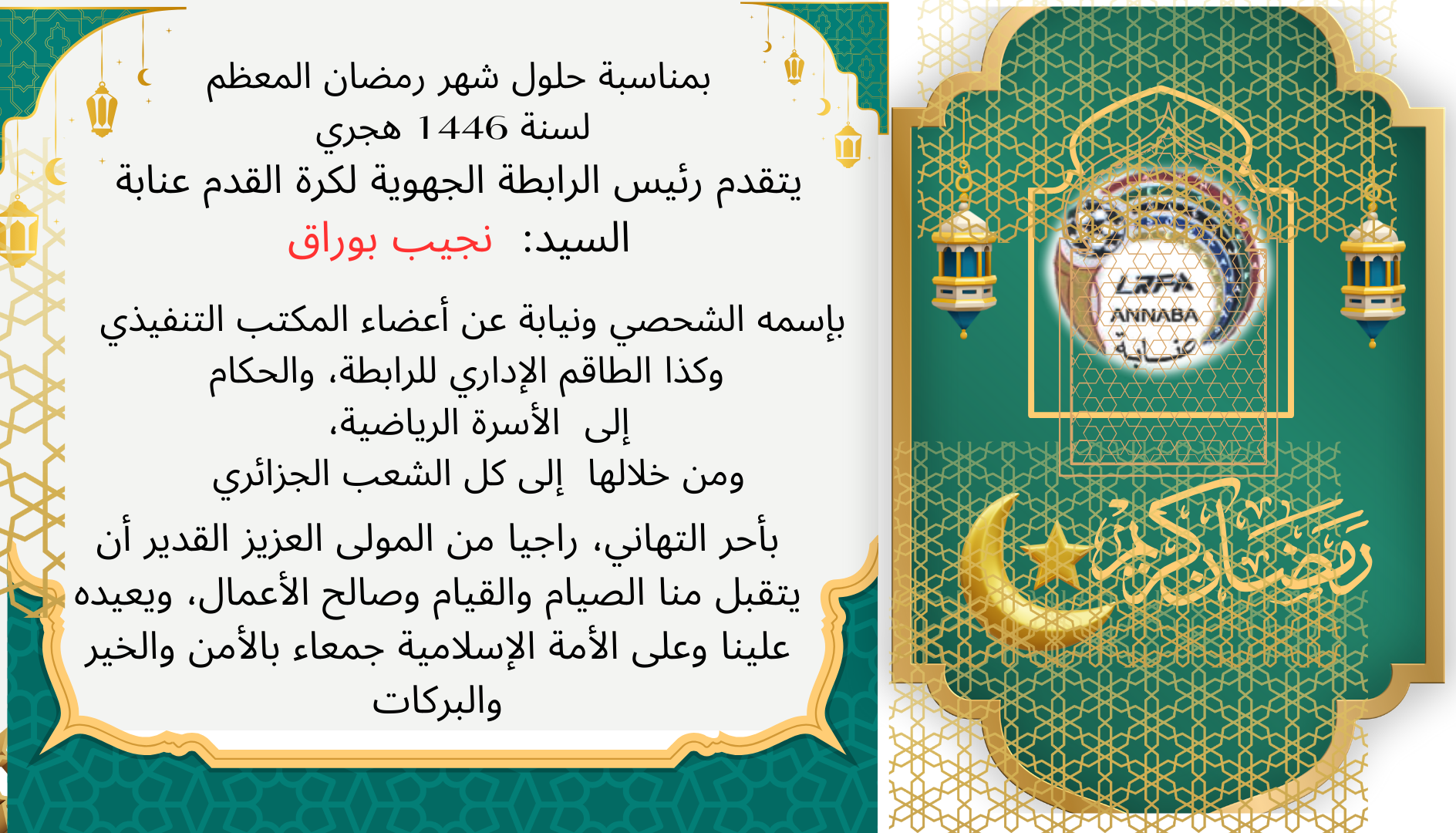 تهاني رئيس الرابطة الجهوية لكرة القدم عنابة السيد نجيب بوراق إلى الشعب الجزائري والأمة الاسلامية جمعاء بمناسبة حلول شهر  رمضان المعظم