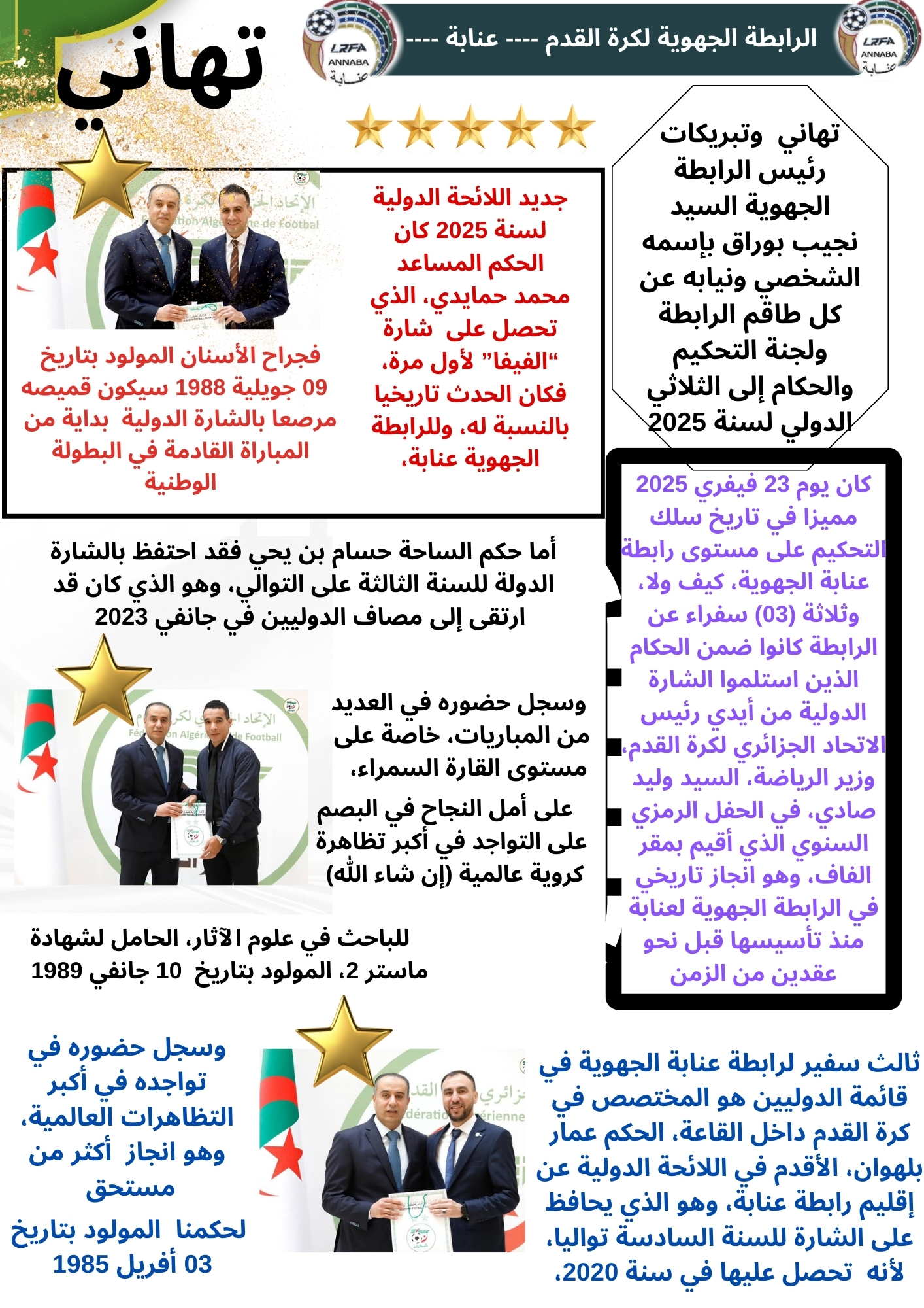رسالة تهنئة من رئيس الرابطة الجهوية لكرة القدم عنابة السيد نجيب بوراق إلى الحكام الثلاثة عن إقليم رابطة عنابة الجهوية المتواجدين ضمن قائمة الحكام الدوليين لسنة 2025 وهم بن يحي حسام، حمايدي محمد وعمار بلهوان