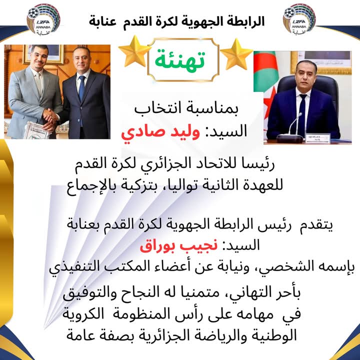 رسالة تهنئة من رئيس الرابطة الجهوية لكرة القدم عنابة السيد نجيب بوراق إلى السيد وليد صادي بمناسبة إنتخابة لعهدة ثانية على رأس الإتحاد الجزائري لكرة القدم