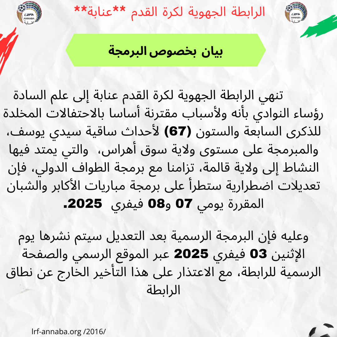 برمجة مباريات الجولة 14 لبطولة الشبان مع التأجيل الاضطراري لكل اللقاءات المقررة بإقليم ولاية سوق أهراس بسبب الاحتفالات المخدة للذكرى 67 لأحداث ساقية سيدي يوسف، وكذا إلغاء برمجة يوم السبت ببلديتي بوشقوف وقالمة