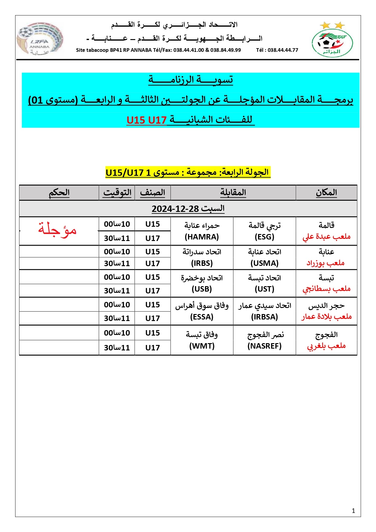 Image برمجـــــــــــــــــــة المقابــــــــــــــــــلات المؤجلــــــــــــــــــة عن الجولة الرابعـــــــــــــــــة (مستوى 01) للفــــــــــــــــــئات الشبانيـــــــــــــــــــــة U15 U17 #