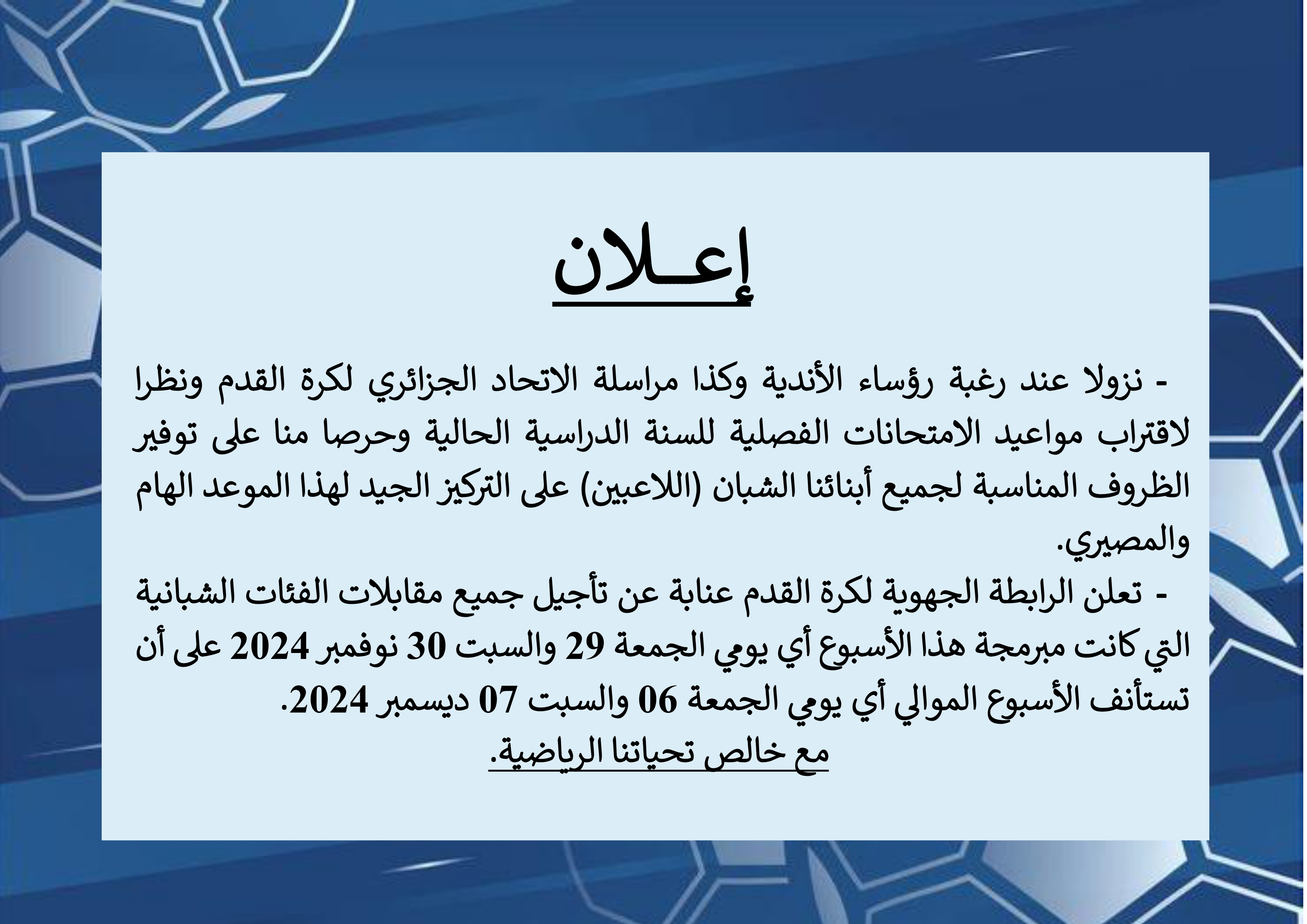محضر ر قم 07 للجنة الجهوية للإنضباط في جلستها ليوم الثلاثاء 26 نوفمبر 2024 (قضايا الجولة السادسة أكابر)