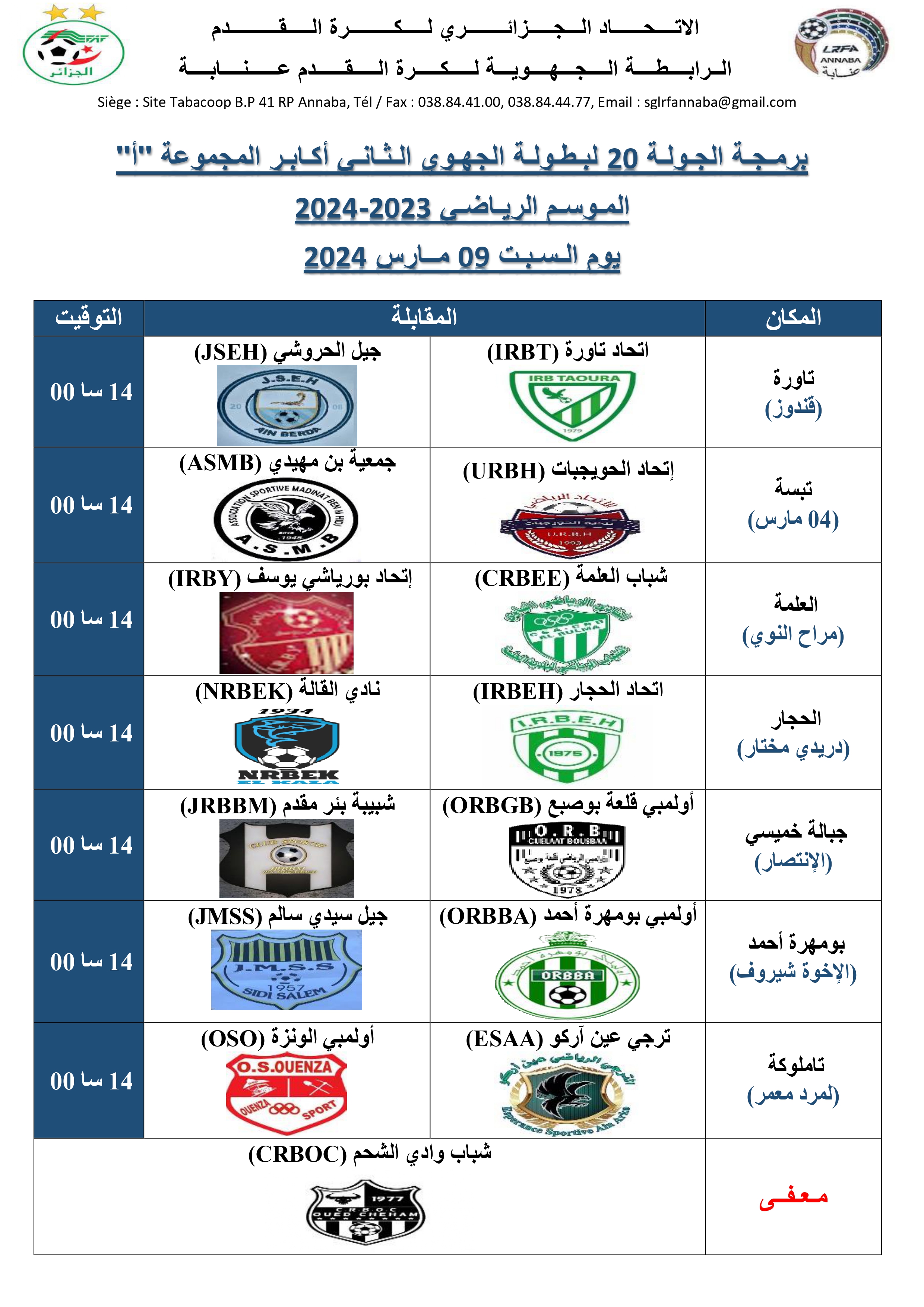 برمجة الجولة 20 لبطولة الجهوي الثاني أكابر المجموعة ''أ'' يوم الجمعة 08 مارس 2024