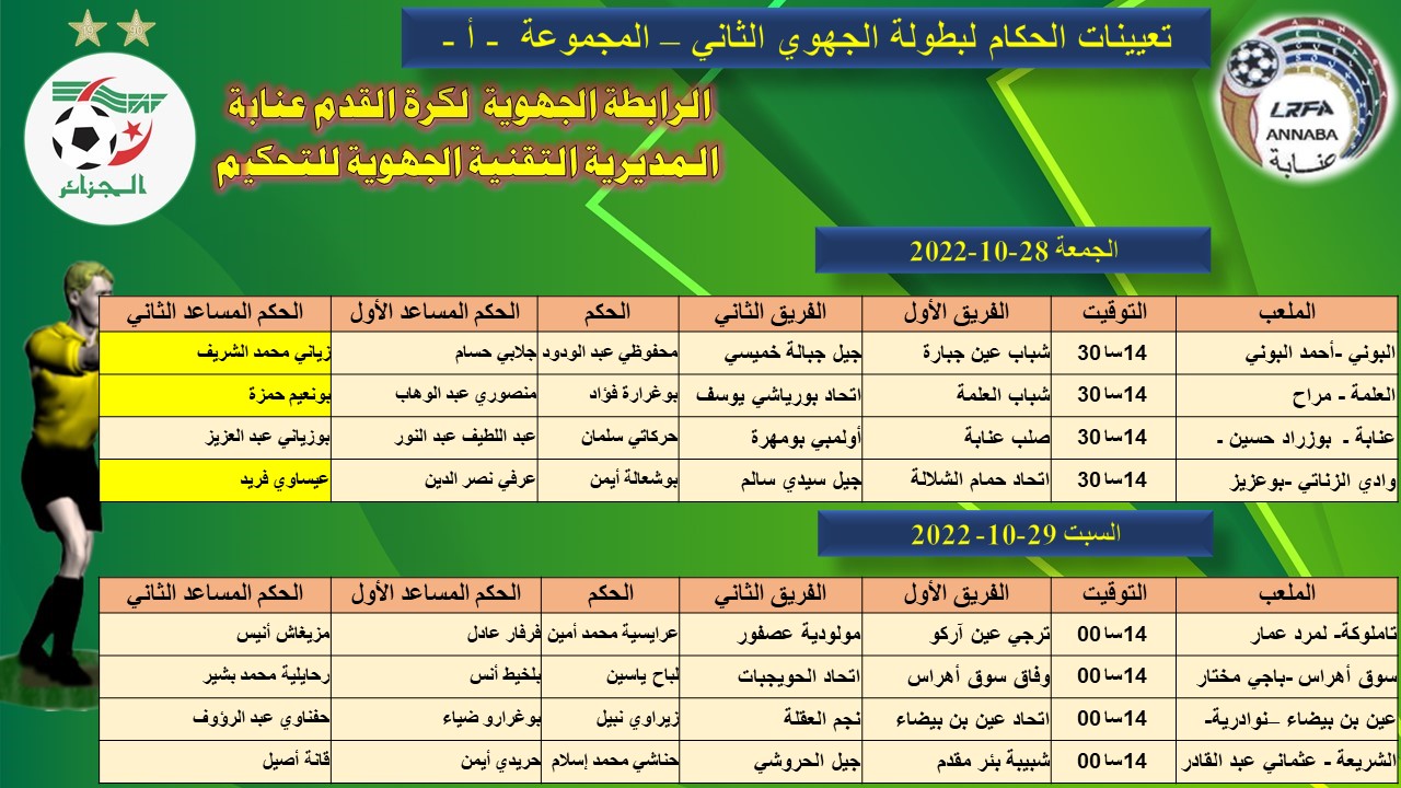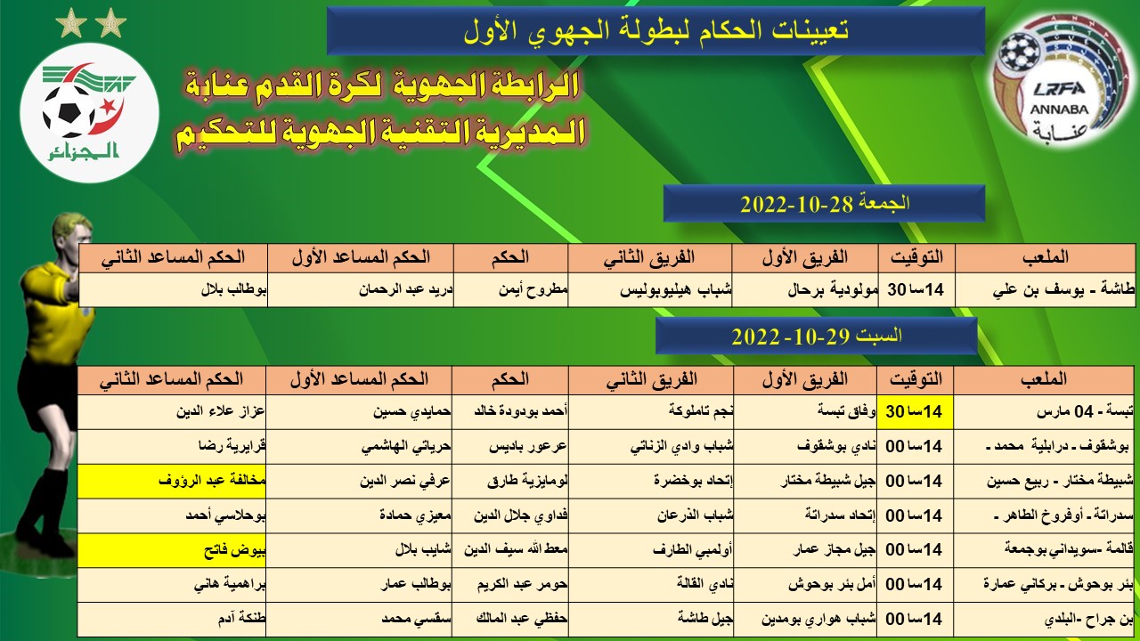 حكام مباريات الجولة الاولى لبطولة الجهوي الاول لرابطة عنابة لموسم 2022 / 202