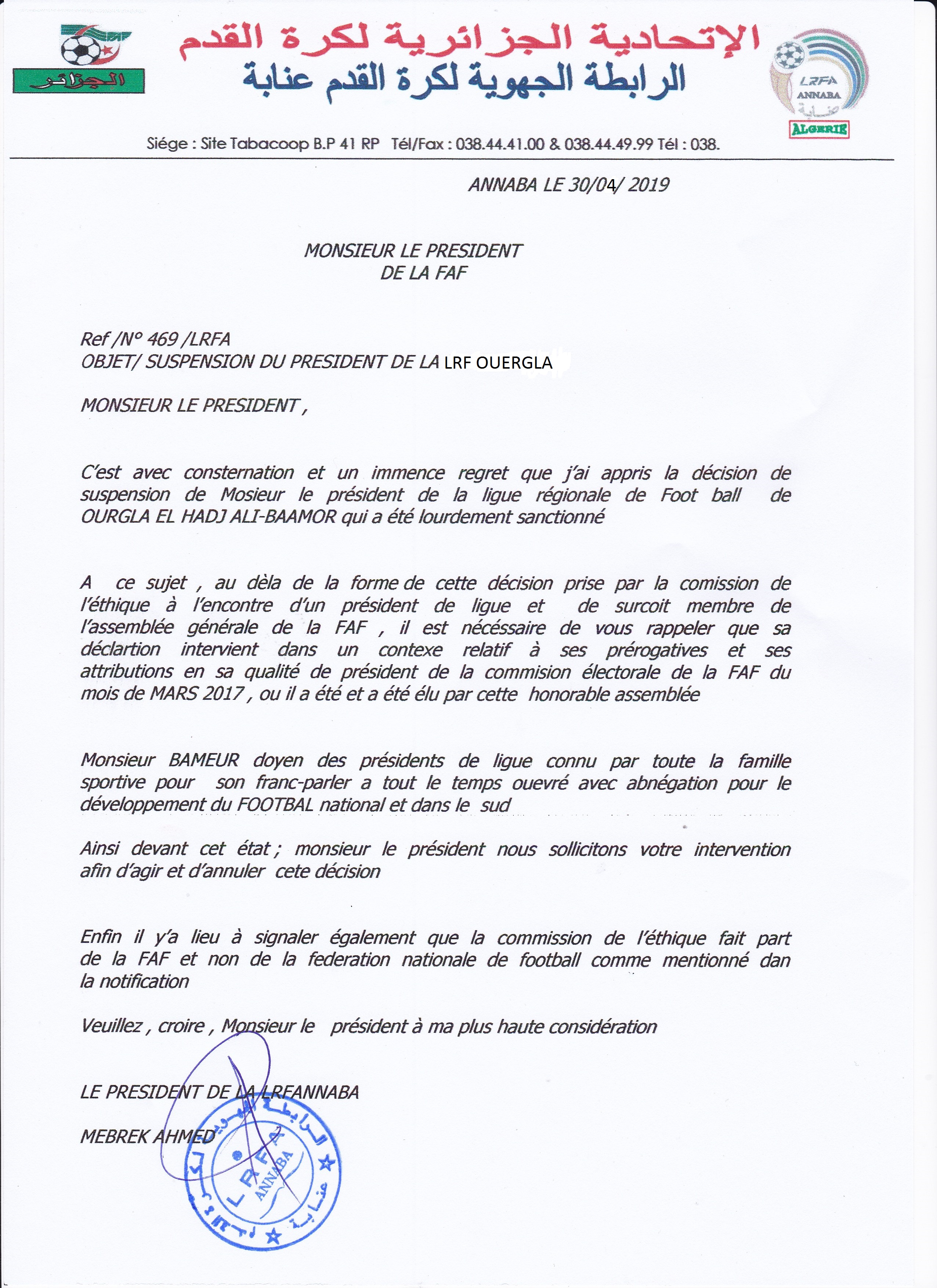 Lettre de la LRF ANNABA a Mr Le président de la FAF concernant le sanction du Mr ALI BA AMOR Président de la LRF. OUARGLA