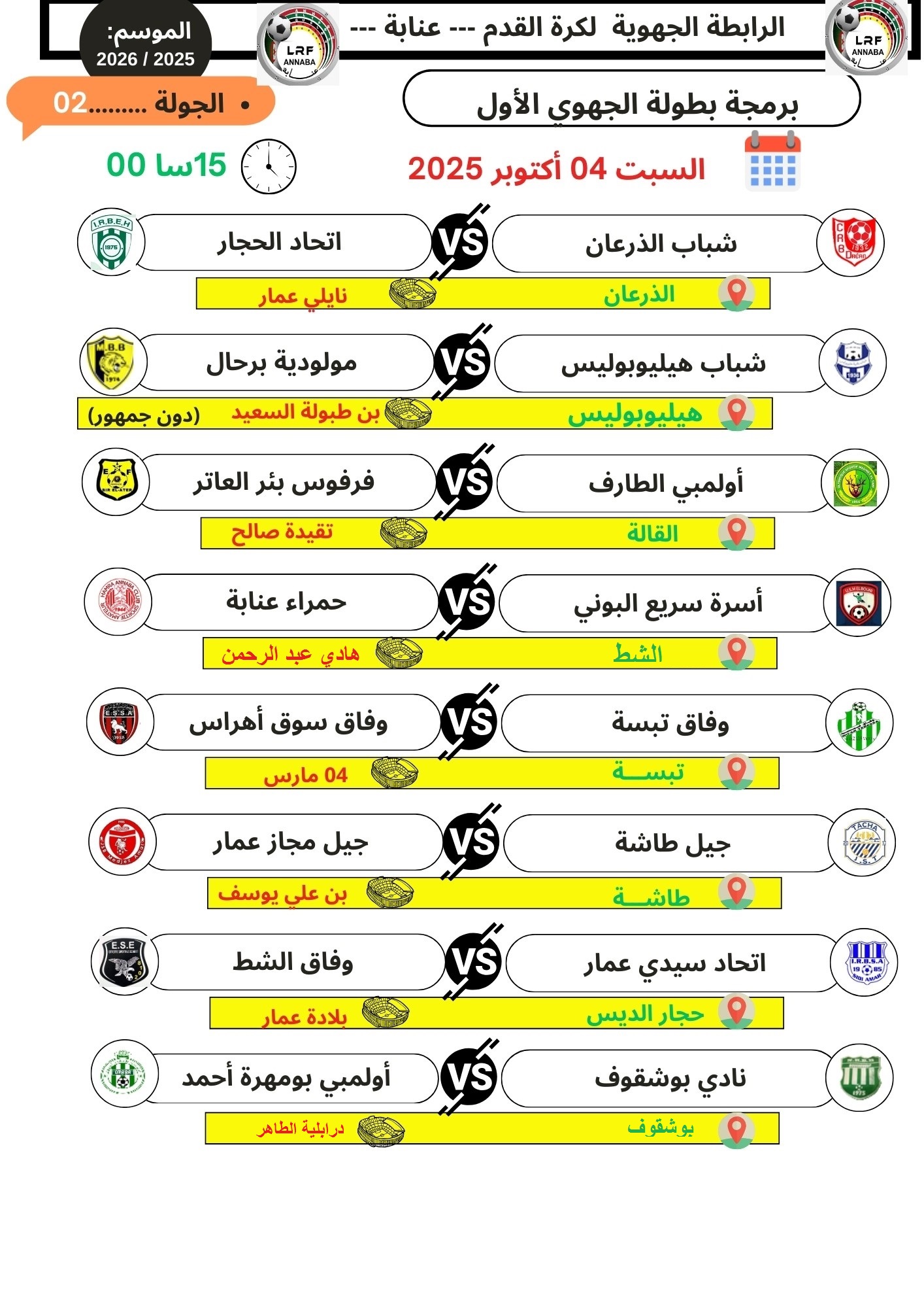 برمجة مباريات الجولة الثانية لبطولة الجهوي الثاني في المجموعة أ ليومي الجمعة 03 والسبت 04 أكتوبر 2025