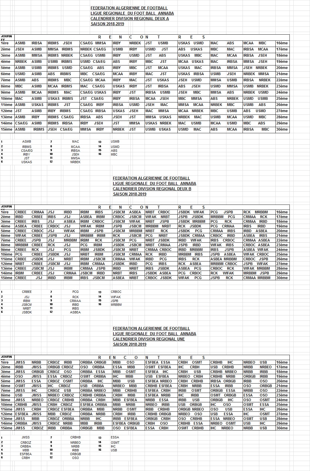 Les présents calendriers saison sportive 2018-2019 établis , peuvent faire l’objet d’une révision après la prorogation des délais d’engagement au 21/09/2018 par le bureau fédéral en.date du 30/08/2018. Au dela de cette date butoir , de nouveaux calendriers seront établis en fonction des clubs réellement engagés Les clubs non engagés à cette date seront déclarés en non activité ( forfait général) LRFA