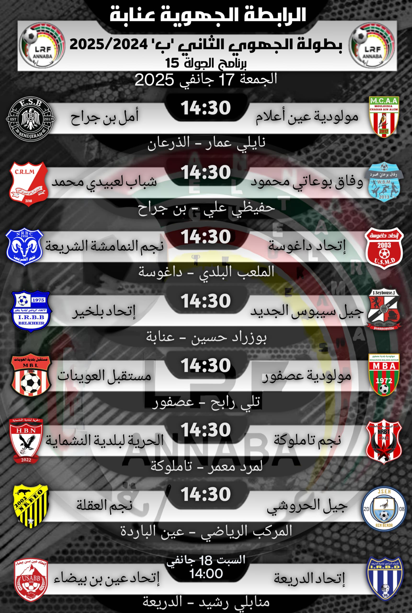 برمجة الجولة 15البطولة الجهوي الثاني أكابر مجموعة ''ب''
