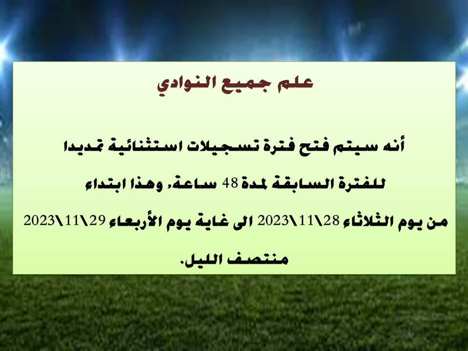 علم جميع النوادي أنه سيتم فتح فترة تسجيلات استثنائية تمديدا للفترة السابقة لمدة 48 ساعة وهذا ابتداء من يوم الثلاثاء 28\11\2023 الى غاية يوم الأربعاء 29\11\2023 منتصف الليل.