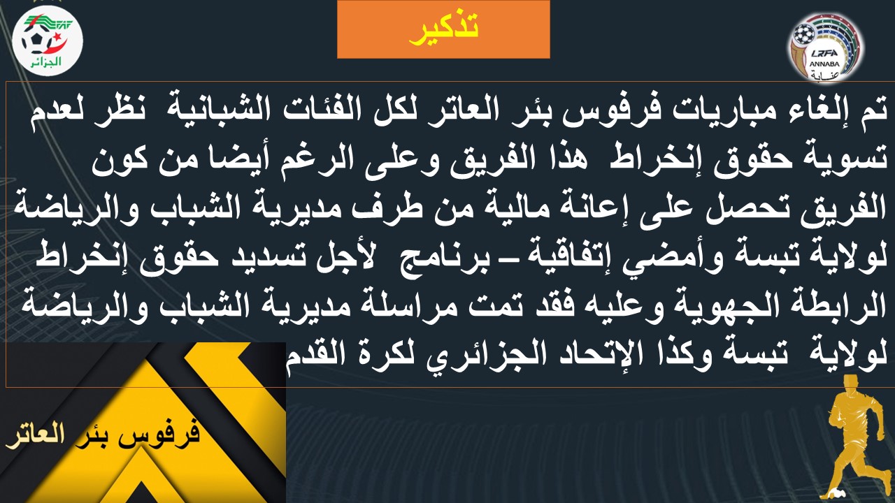 Image بخصوص أإلغاء مباراة ترجي قالمة -فرفوس بئر العاتر لأقل من 15 سنة #