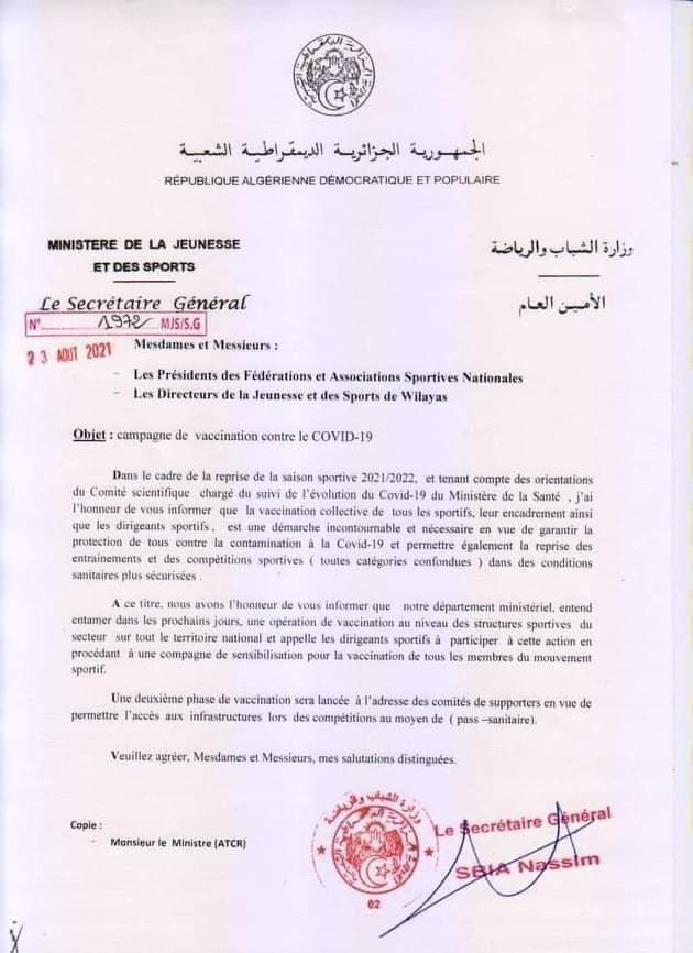 Communiqué concernant l'obligation de vaccination contre COVID 19 pour tous les acteurs de la famille sportive afin d'assurer la reprise des activités pour la saison (2021 / 2022)