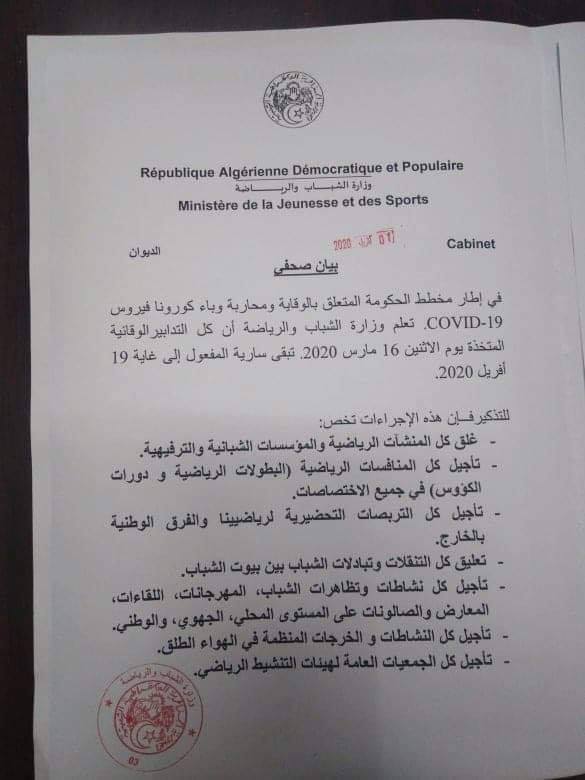 Prévention du coronavirus COVID 19Prolongation du report de toutes les activités et compétitions sportives jusqu'au 19 AVRIL 2020 ... (Communiqué MJS)