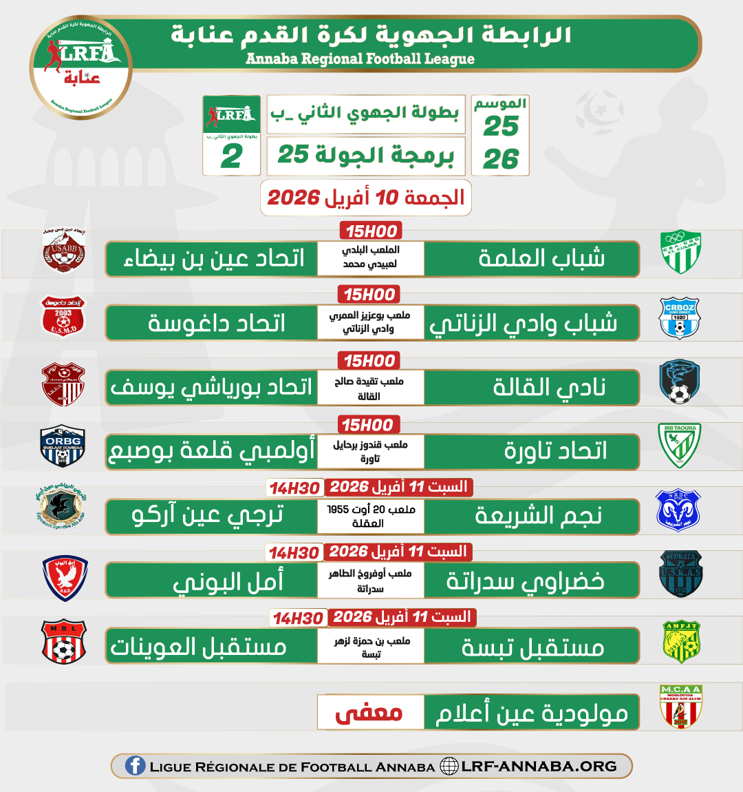 تعديل مباراة نجم الشريعة و ترجي عين آركو تلعب يوم السبت 11 أفريل بملعب 20أوت 1955 بالعقلة