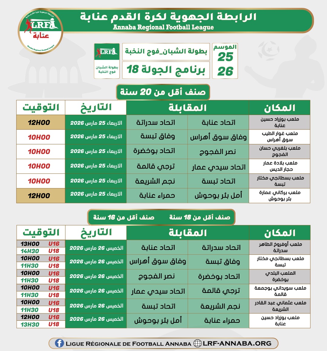 برمجة مباريات الجولة 18 لبطولة الأصناف الشبانية في فوج النخبة