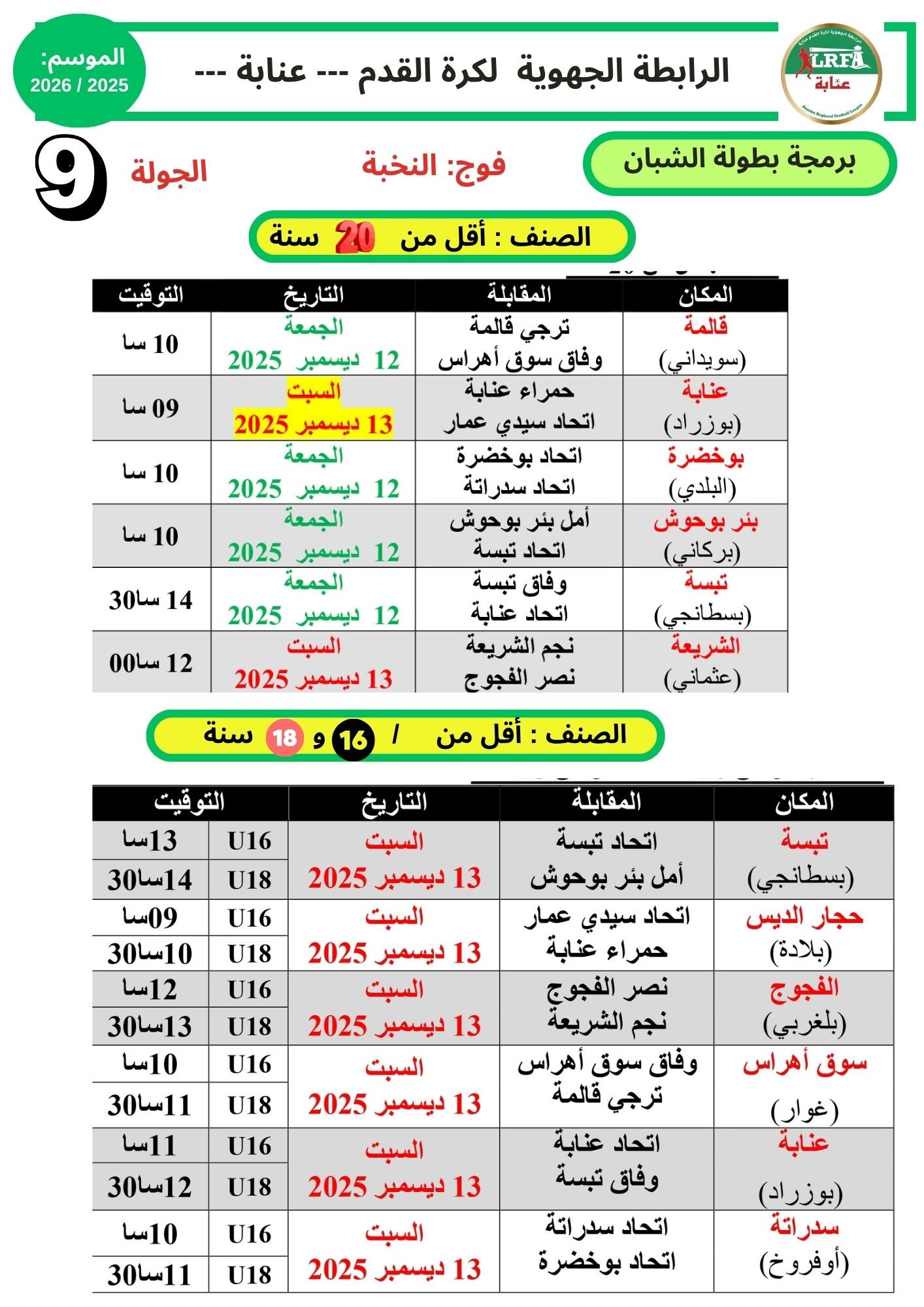برمجة مباريات الجولة 09 لبطولة الاصناف الشبانية في فوج النخبة ليومي الجمعة 12 والسبت 13 ديسمبر 2025